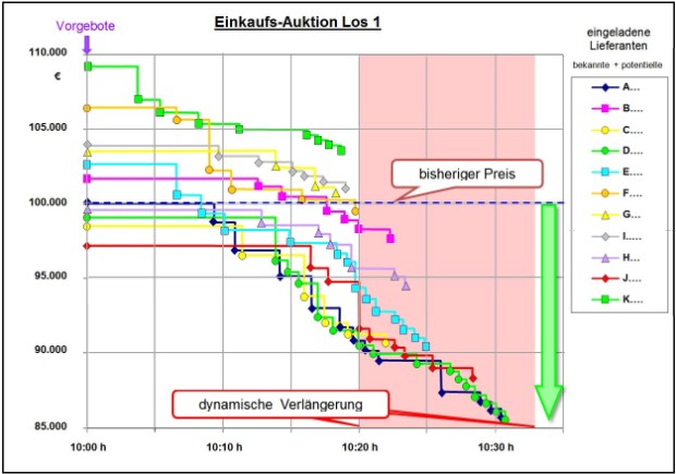 Beispiel: zeitlicher Verlauf einer online Einkaufs-Auktion mit 11 Bietern